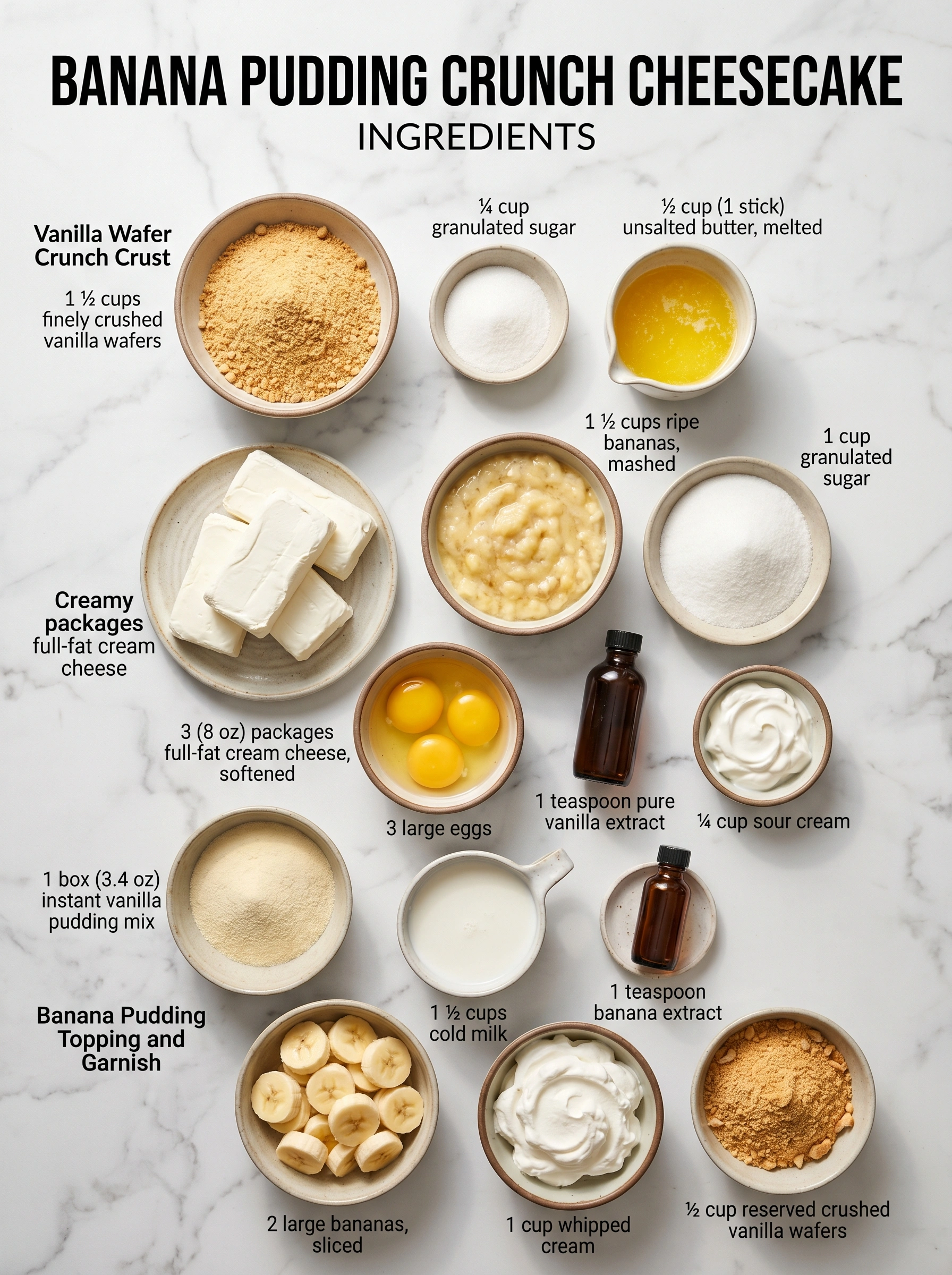 Gathering the right ingredients is the first step to perfection. We focus on quality and freshness to ensure the creamiest filling and crunchiest crust. Here is everything you need for this spectacular banana pudding cheesecake.