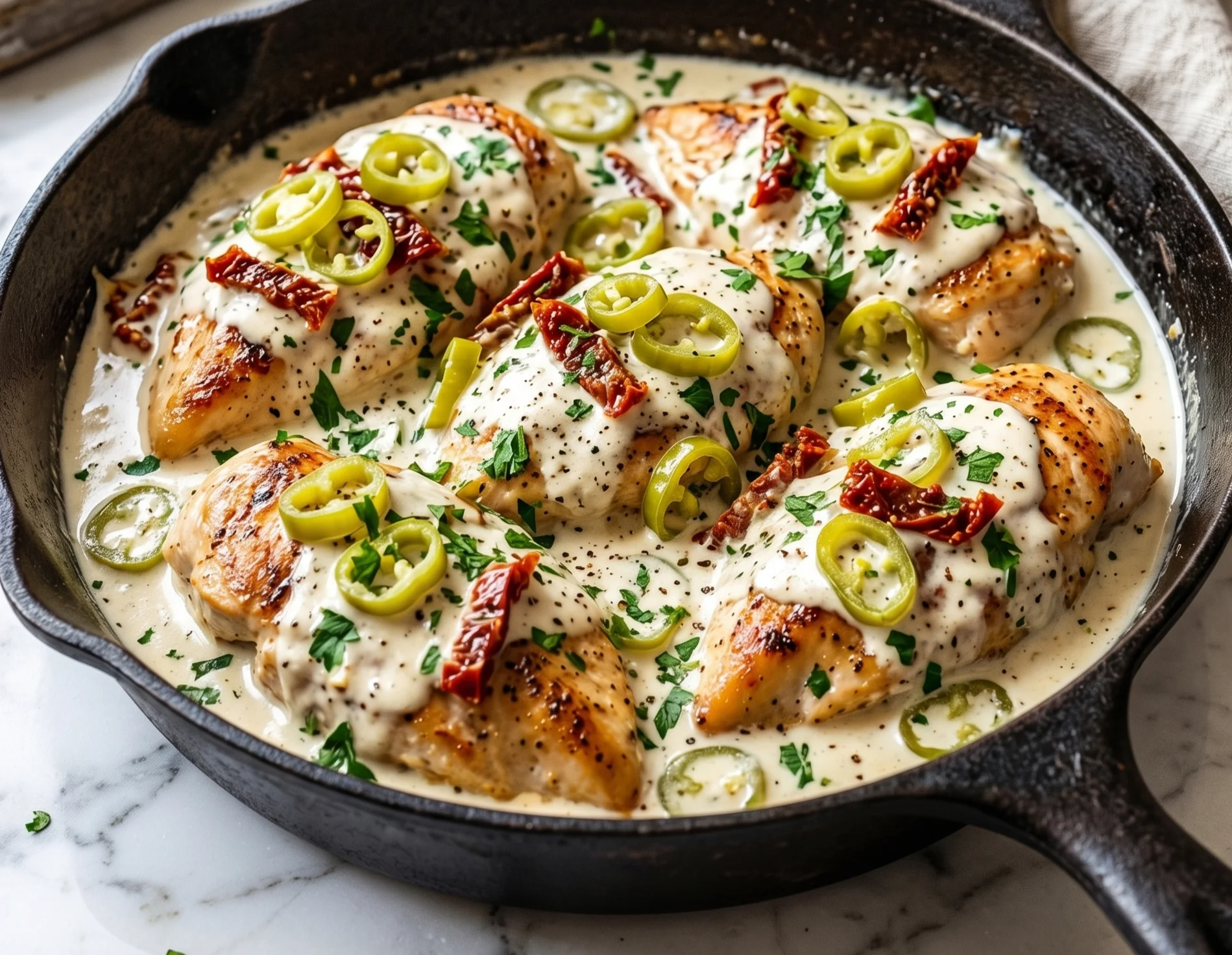 This Creamy Pepperoncini Chicken Skillet comes together 40% faster than traditional chicken skillet recipes, which typically require 50+ minutes. The streamlined cooking process eliminates unnecessary steps while maximizing flavor development, making it ideal for weeknight cooking.